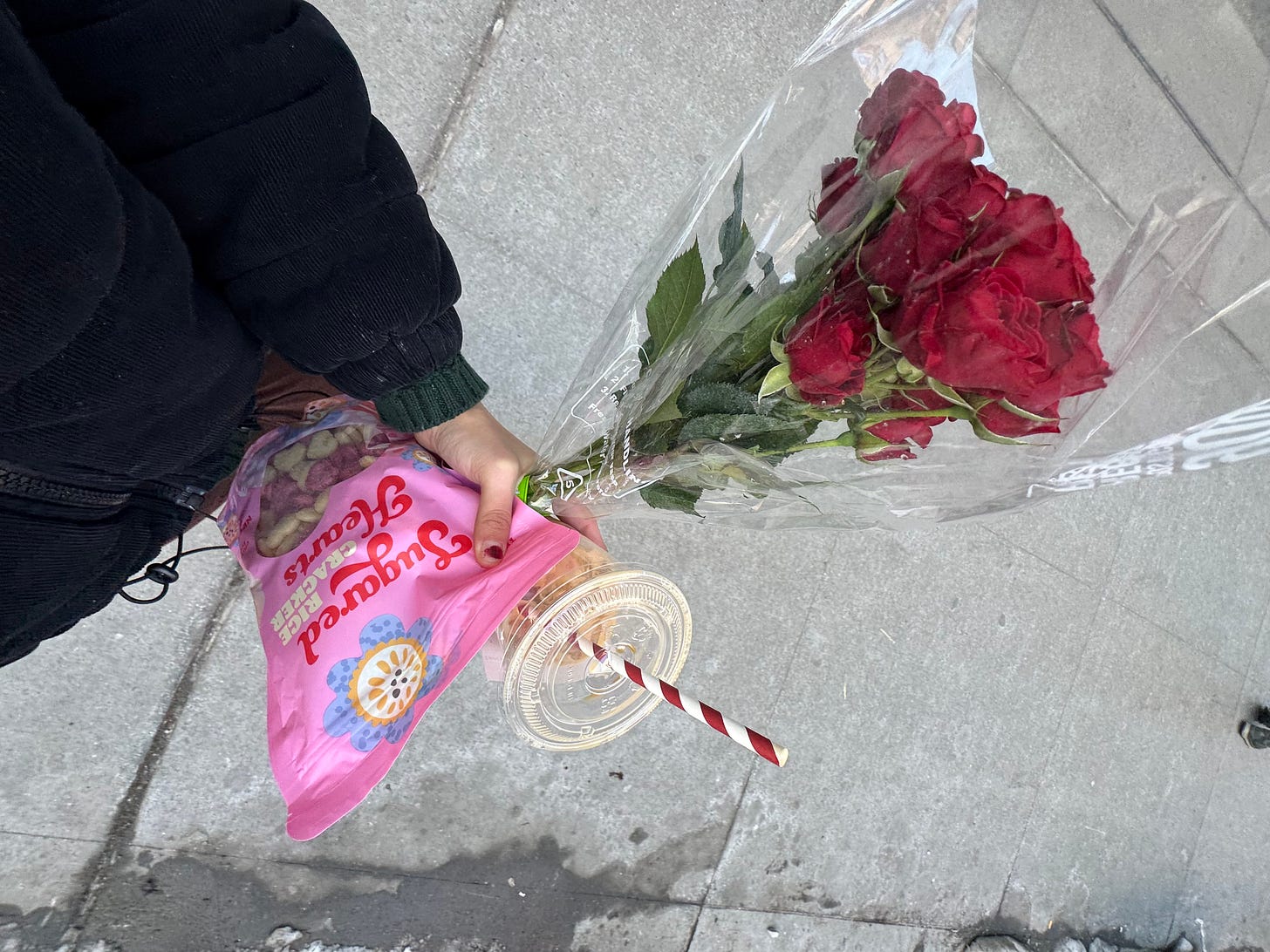 Voice memo-ing in public is not as fun right now, because I’m doing speech to text instead of a voice memo, so I’m talking in very languid, slow motion sentences to get the voice to text to process what I am saying. Speaking in a very robotic tone because I am being lazy and don’t want to have to transcribe a real voice memo later. It feels nice to observe all of these different types of people holding flowers. I just passed by a boy who couldn’t have been older than like, eighth grade holding a big bouquet of roses. How sweet. Everything feels so sweet today. Love is in the air, I suppose! OK I’m in front of the Trader Joe’s now.