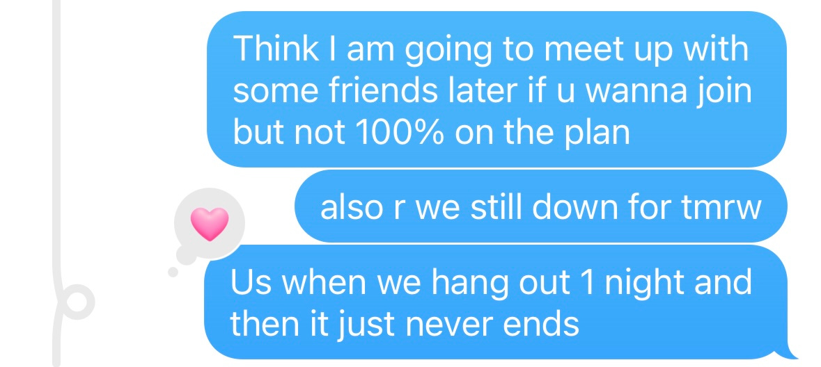 In the mood to see a friend tonight. Contemplating who I should text. As I was about to hit send on a proposition in my group chat, Ruby’s close friend Amelie has just texted me out of the blue. What are the odds of this? Kismet! “hiii, how are you❤️” she said. I responded that I am feeling tumultuous and sitting at a cafe, pretending to work on my laptop. She responded that she is also: feeling tumultuous and sitting at a cafe, pretending to do work on her laptop. “Should we hang out tonight?” I texted her. “I think we should.” She responded.