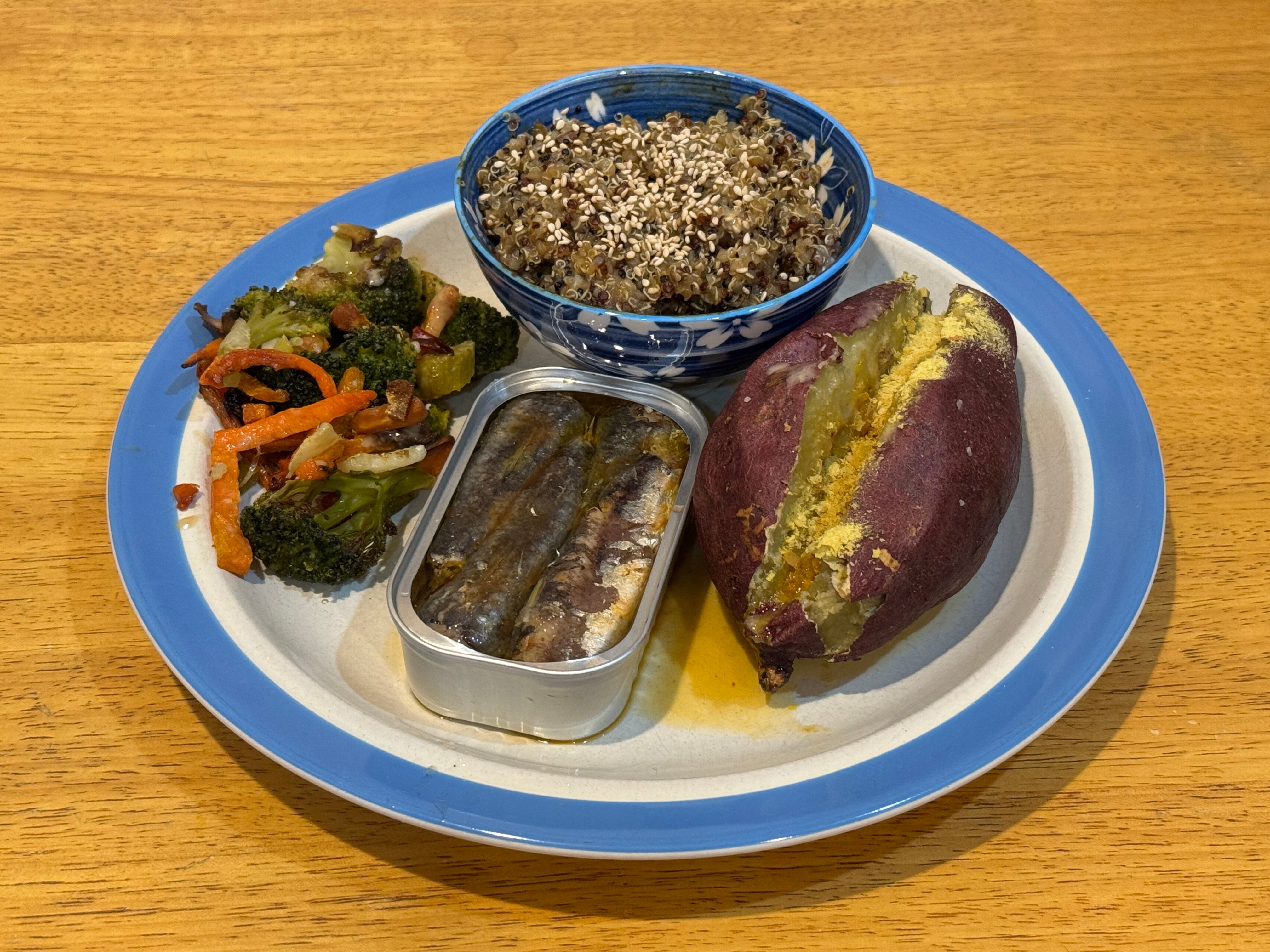 DINNER TIME. FINALLY. This is amazing. Everything is cold but I do not care this is the best thing I have consumed, maybe ever. I did an amazing job. I am so happy. Wow. Veggies, finally! Sardines always! A lukewarm cup of tea, always! Sweet potato is kinda strange, but I’m into it. I don’t hate it. I probably wouldn’t repurchase, but it will all be consumed with immense delight.